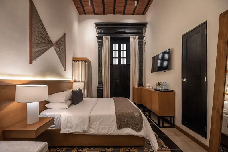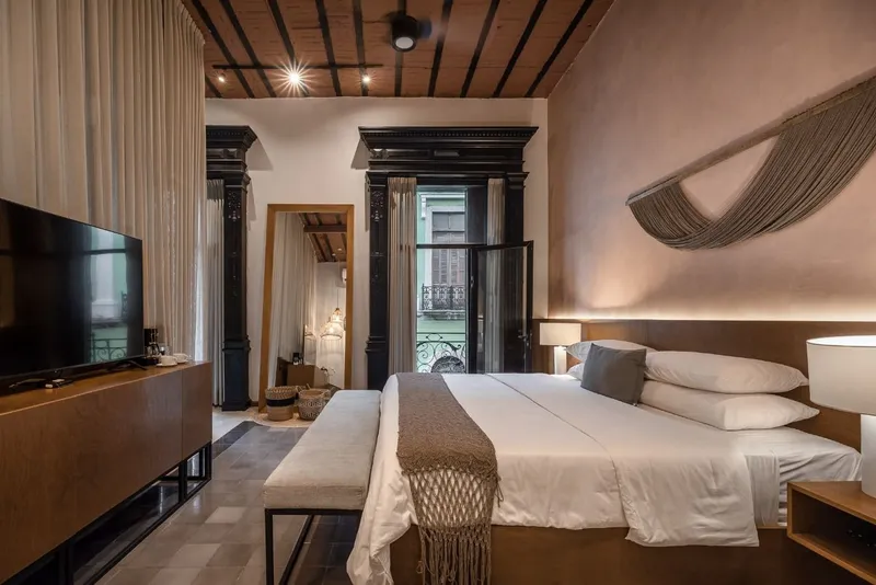 With a French architectural style and original doors from 1845, these rooms will transport you through time, giving you a unique colonial experience, combining modern rest and comfort; Enjoy your balcony, where you will discover incredible views of the main street of the historic center. This room has a queen size bed, ideal for those traveling individually or as a couple. AMENITIES: -Air conditioning and ceiling fans -42-inch flat screen (Smart TV) -Organic amenities with natural ingredients from the region -Wifi -Room service -Minibar (with charge) -Closet.